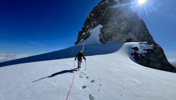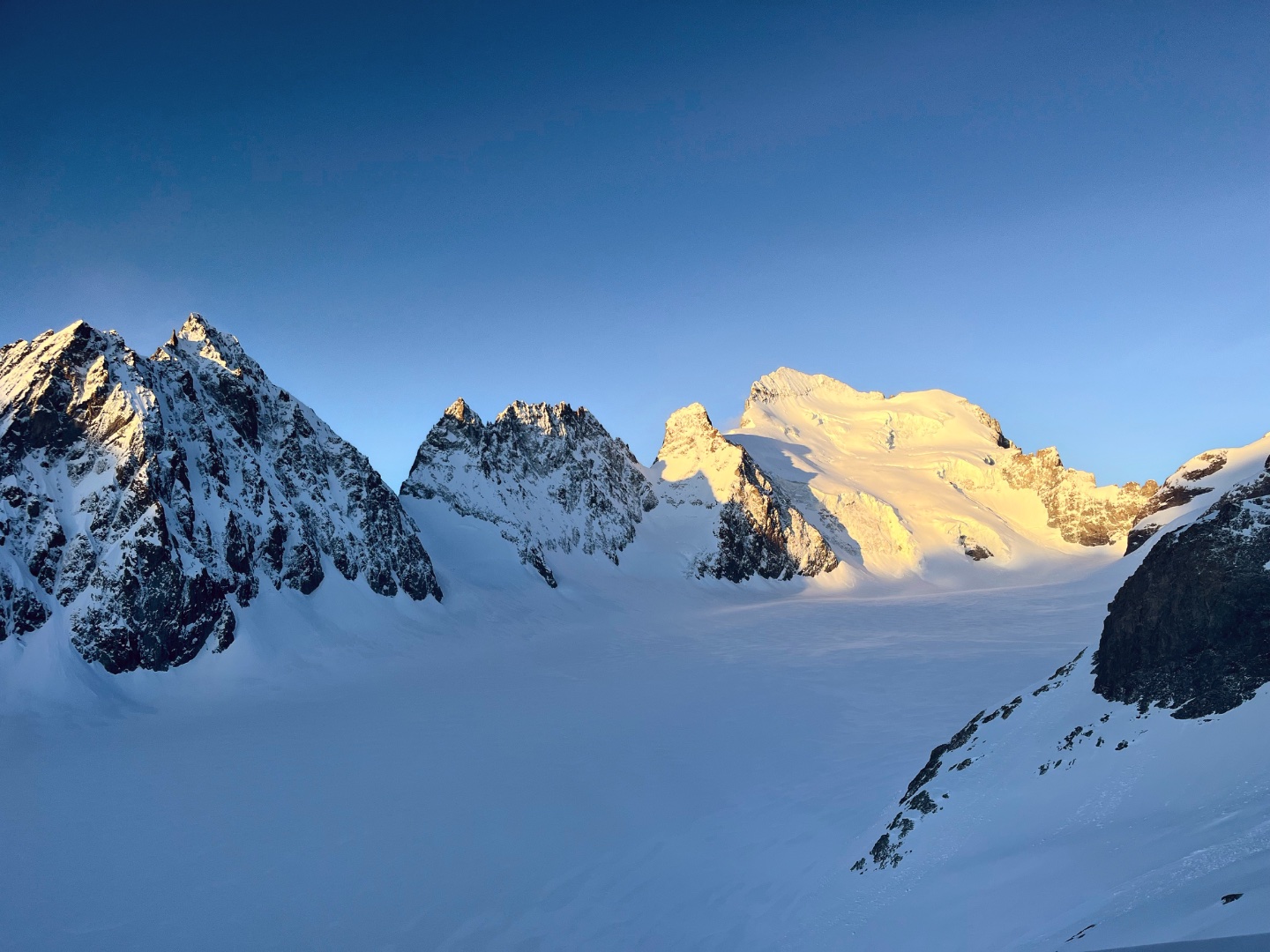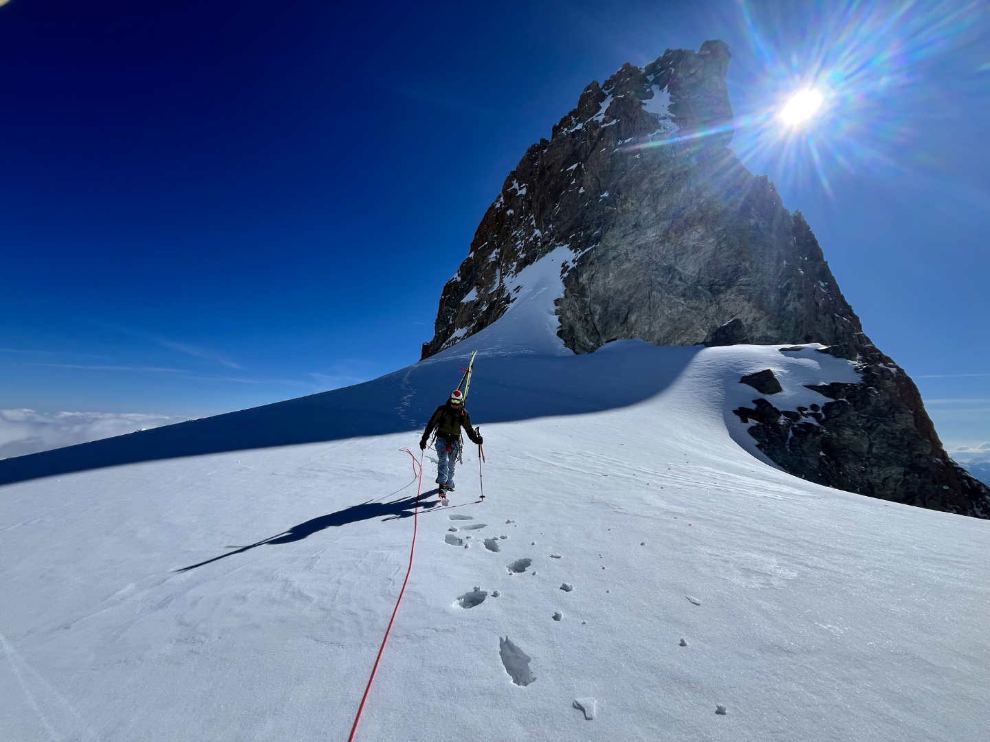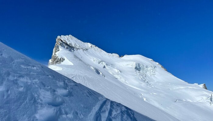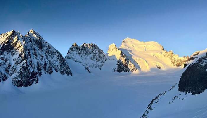 2° jour : Le Dôme de Neige des Écrins et ses 4015 m, avec au sommet et sous le ciel bleu des Alpes du Sud, un panorama grand angle.