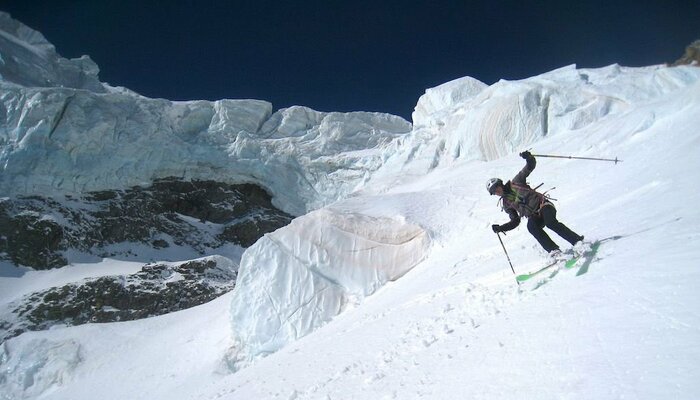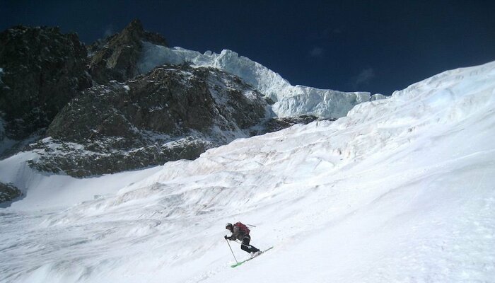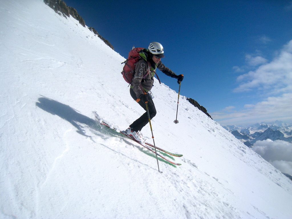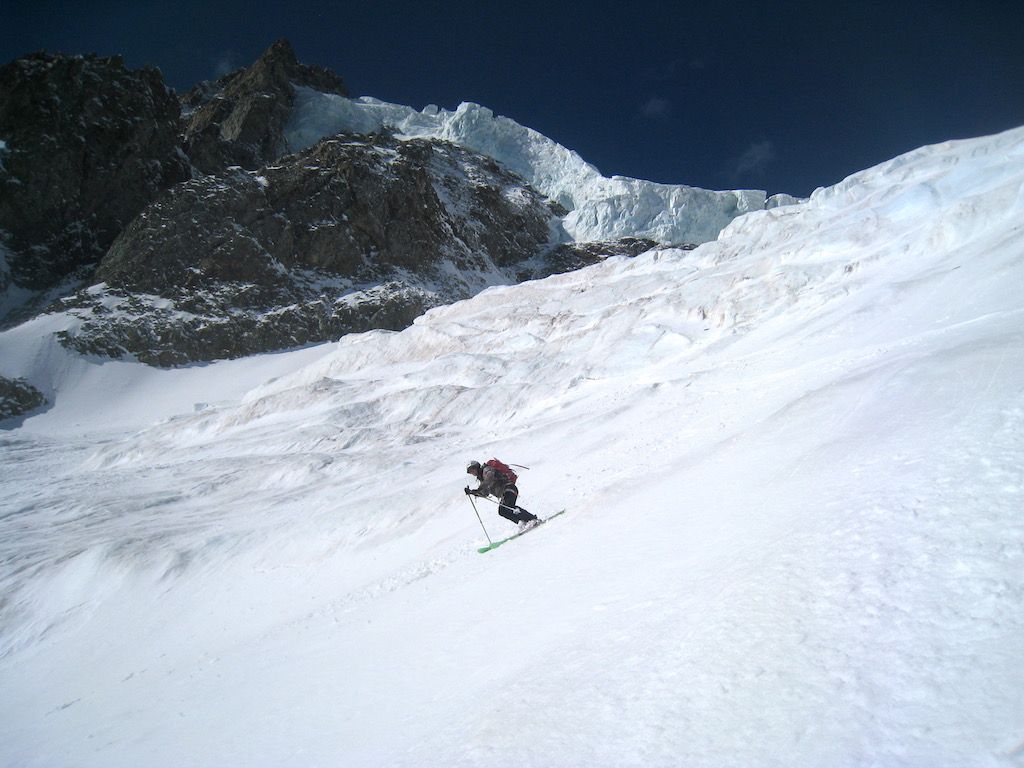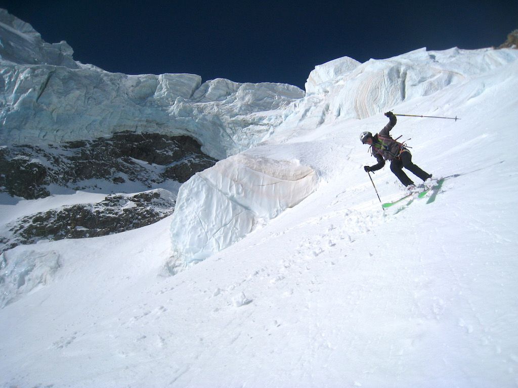 Avec Alain nous arrivons les premiers au sommet et sommes donc les premiers à nous engager sur le glacier des Violettes. Pas une trace. Photo à l’appui, Damien m’a montré le passage à suivre, tout à ski, au cœur des séracs. Ce matin je prends la mesure de cette partie de l’itinéraire que je sous-estimais un peu. Raide, mais pas trop... comme j’aime finalement ! Et cette délicieuse incertitude d’un cheminement complexe, sinueux qui se dévoile peu à peu et met l’intuition et tous les sens en alerte.