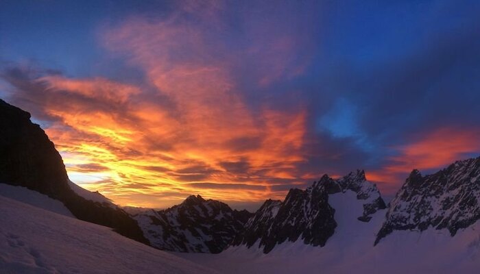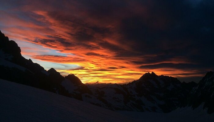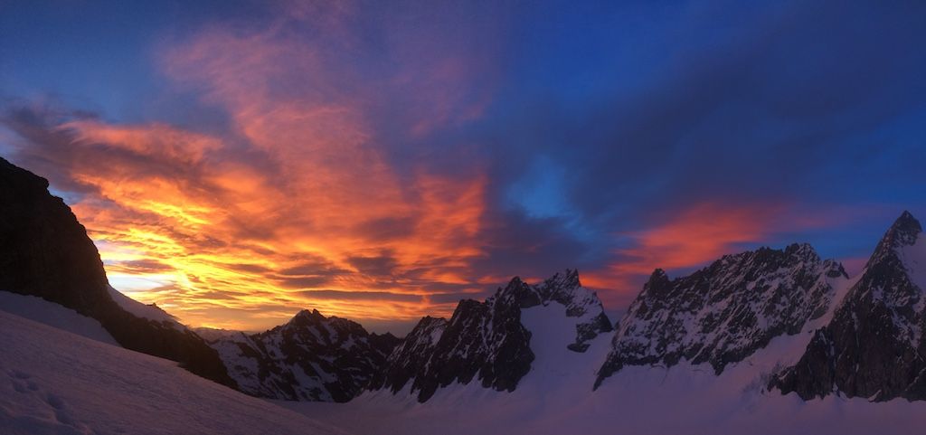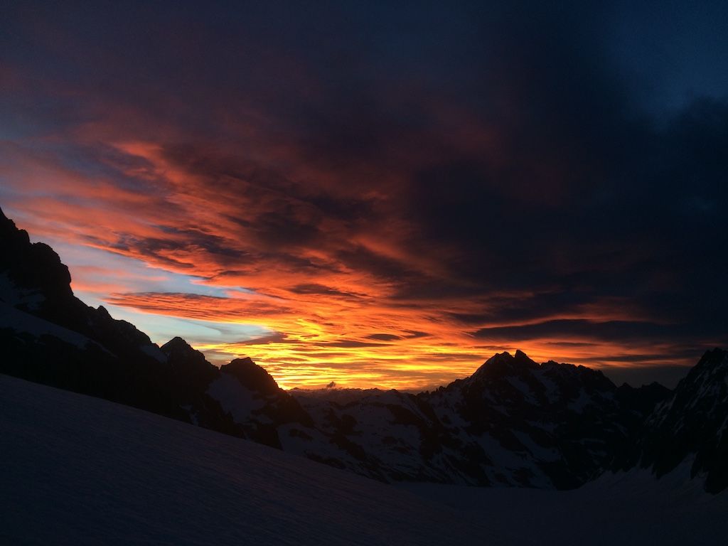 Les excellentes conditions d’enneigement rendent la marche très agréable, surpris par l’incandescence de l’aube nous sommes pris de stupeur et tremblements, puis nous continuons via l’aérienne et pourtant débonnaire arête sommitale.