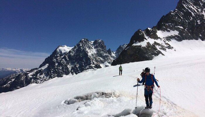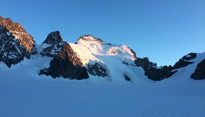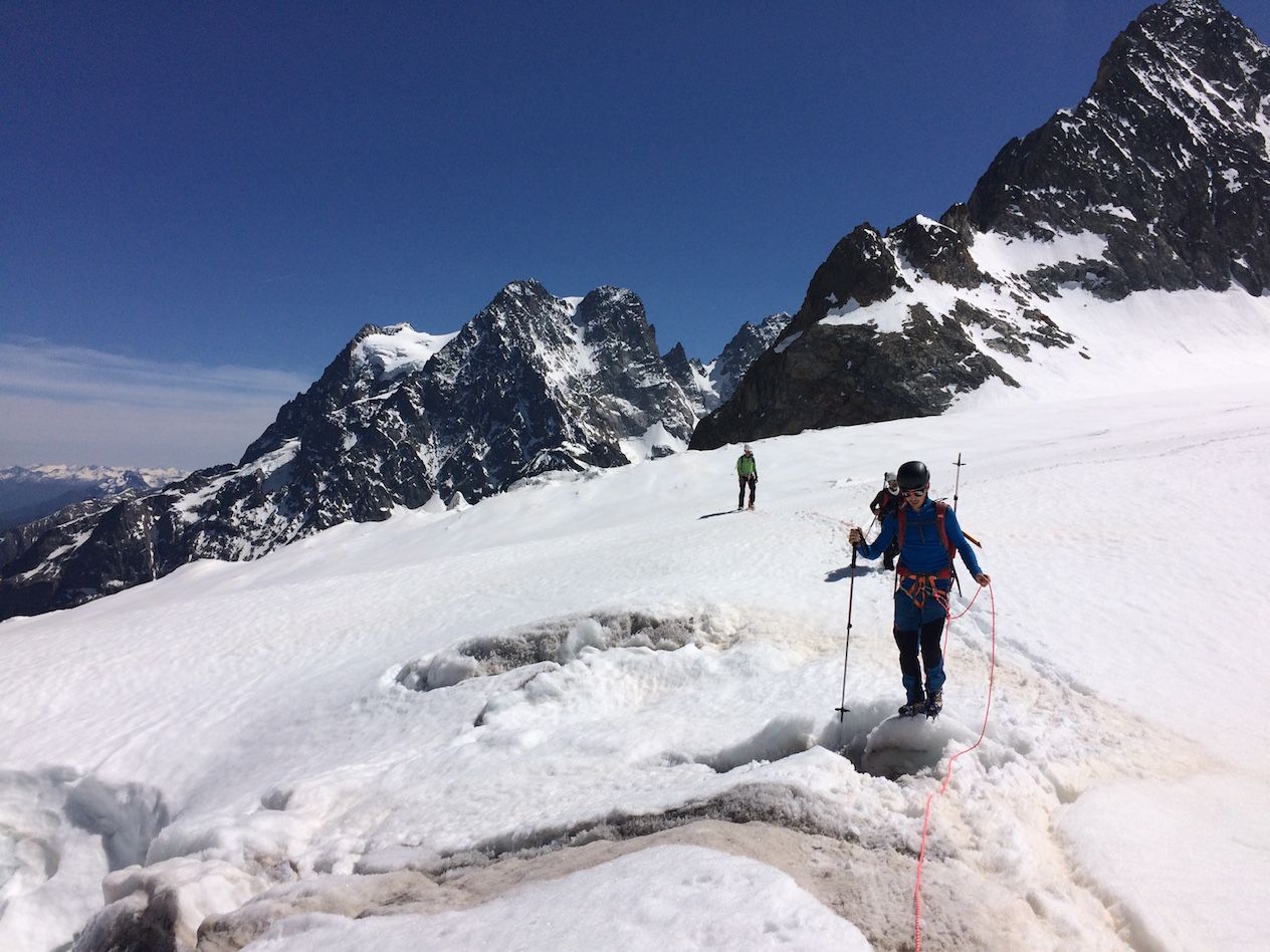 Le samedi 8 juin, avec un groupe de six valeureux Tarbais, nous révisons les rudiments du déplacement en crampons sur les langues terminales de glace du glacier blanc, sous un ciel céruléen ne laissant rien paraître de la fureur qui s’abattra sur ces montagnes la nuit suivante.