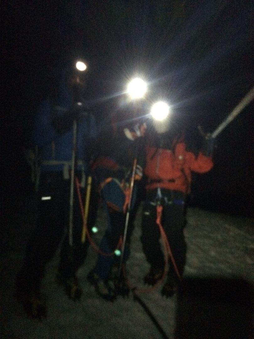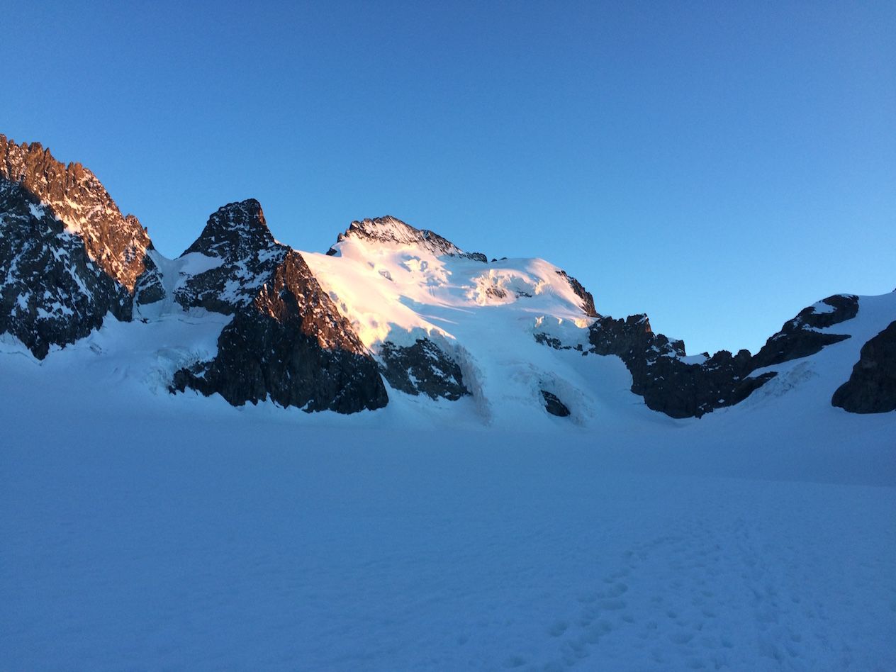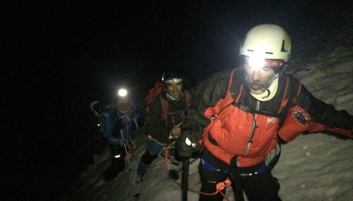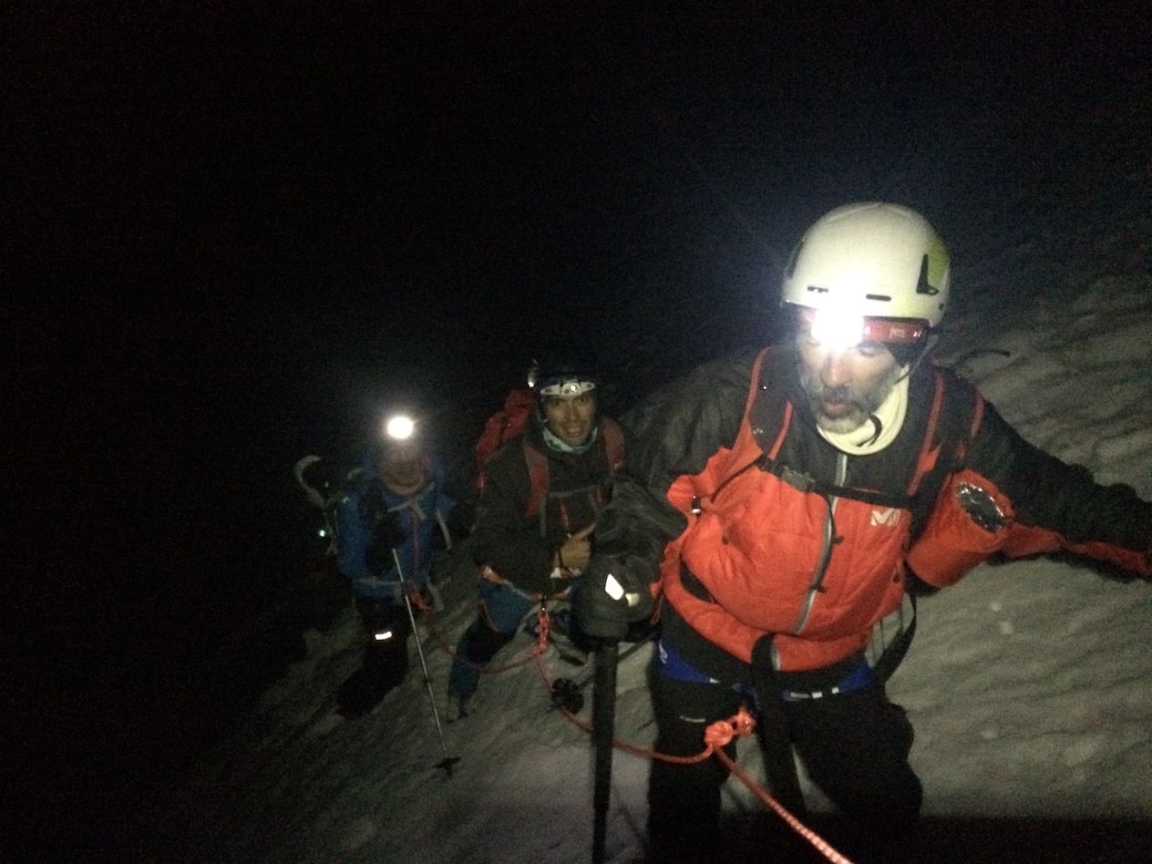 Départ à 20h30 du refuge, les conditions sont bonnes, la trace directe (évitant une grosse partie des séracs) est raide, nous progressons rapidement et nous sommes au sommet 3 heures plus tard, le ciel est étoilé, nous distinguons quelques sommets lointains : des Ailefroides au Kilimandjaro. Paradoxalement, plus on monte vite et moins on se fatigue, ce théorème est vérifié par de nombreux guides, mais contesté par leurs genoux.