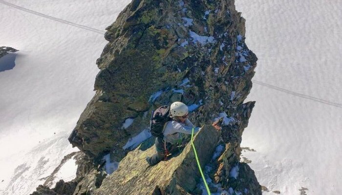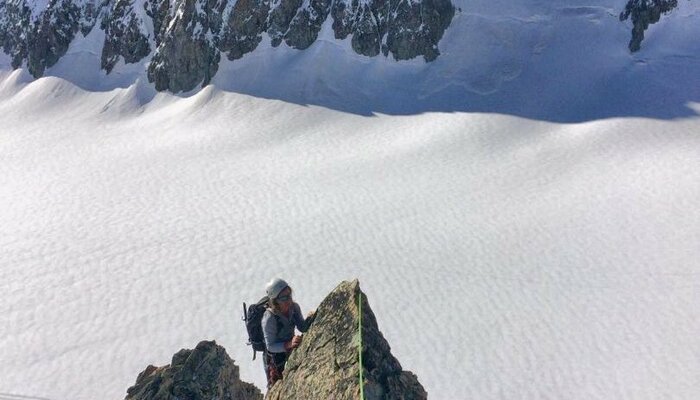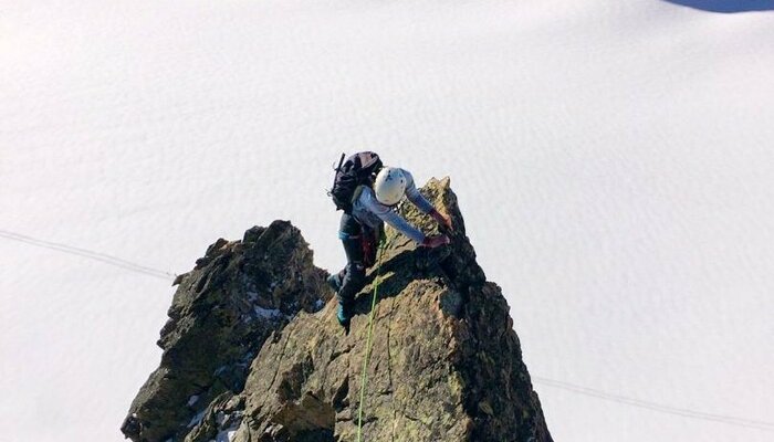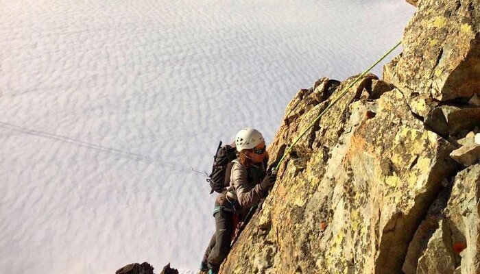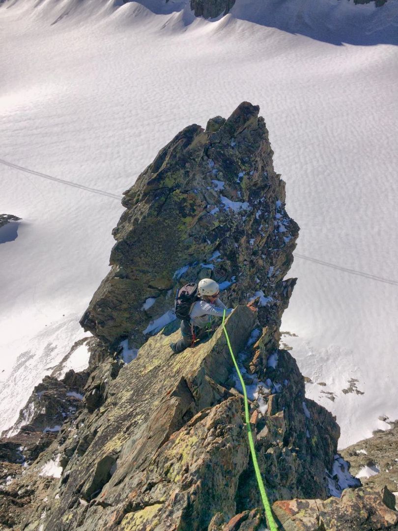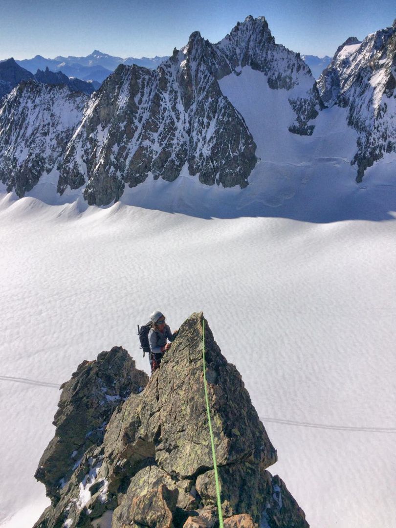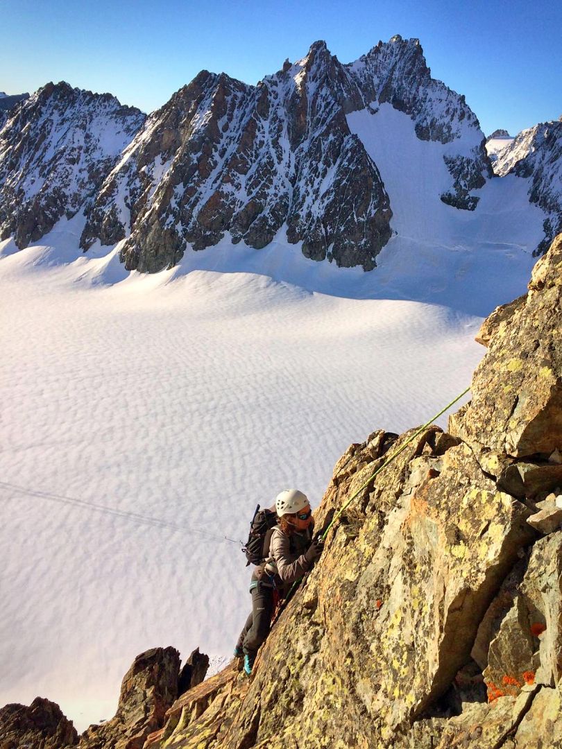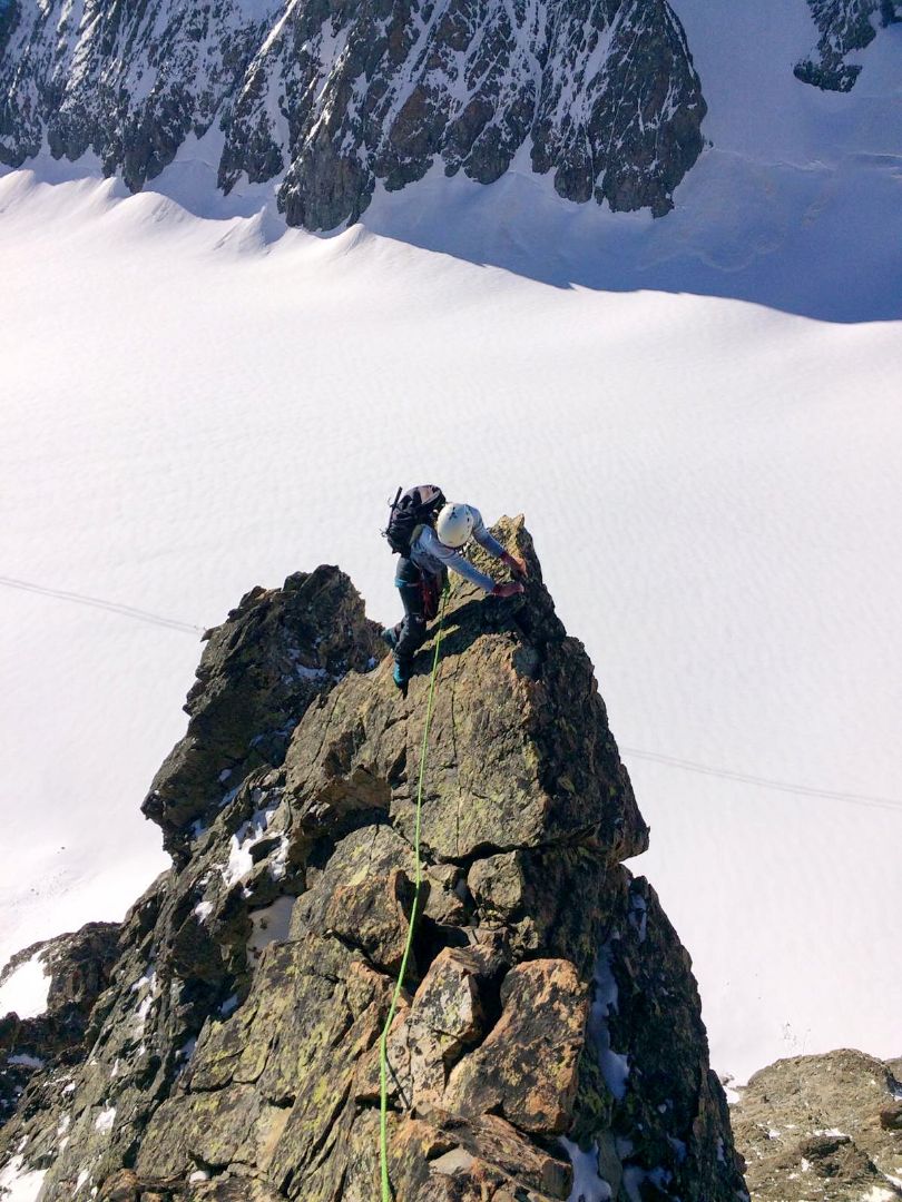 Cette fréquentation causa des embouteillages au Dôme, une longue file d’attente au sommet de Roche Faurio, nous étions seuls avec Marine à l’arête sud-est de la Pointe Louise, pourtant toute proche. Effilée et aérienne, toujours grimpante, mais jamais difficile (IV max) sur du rocher très sain, cette classique dispose de tous les atouts pour vous séduire.