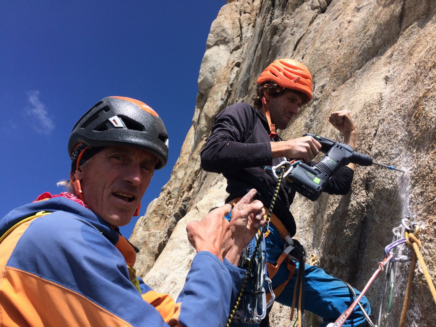 L’objectif est de maintenir l’équipement en place en respectant l’esprit des premiers ascensionnistes, nous changerons une vieille plaquette par une nouvelle aussi solide que rutilante et éventuellement si la pose de coinceurs peut se substituer logiquement à l’une d’entre elles nous ne la remplacerons pas. Sous la coordination de Fred Roulx du bureau des guides des écrins (grand équipeur par la taille et l’expérience) nous partîmes trois guides usés, mais par un prompt renfort, nous nous vîmes plein de vigueur en attaquant les efforts, au refuge du sélé nous attendait un apéro royal nous permettant de survoler les dalles, à nous voir marcher avec un tel visage, les plus fatigués reprenaient du courage.