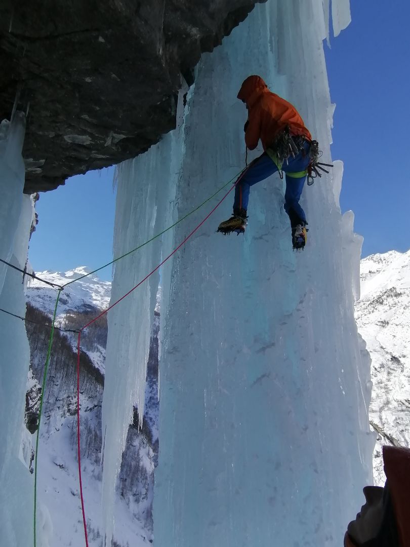 Au retour, nous constatons que ce n’était pas seulement l’excitation qui nous réchauffait, les températures ont radicalement augmenté pendant la journée. La cascade coule abondamment sur nos vestes et sur le rocher, la neige botte sous nos crampons.