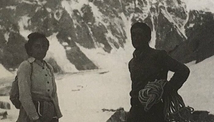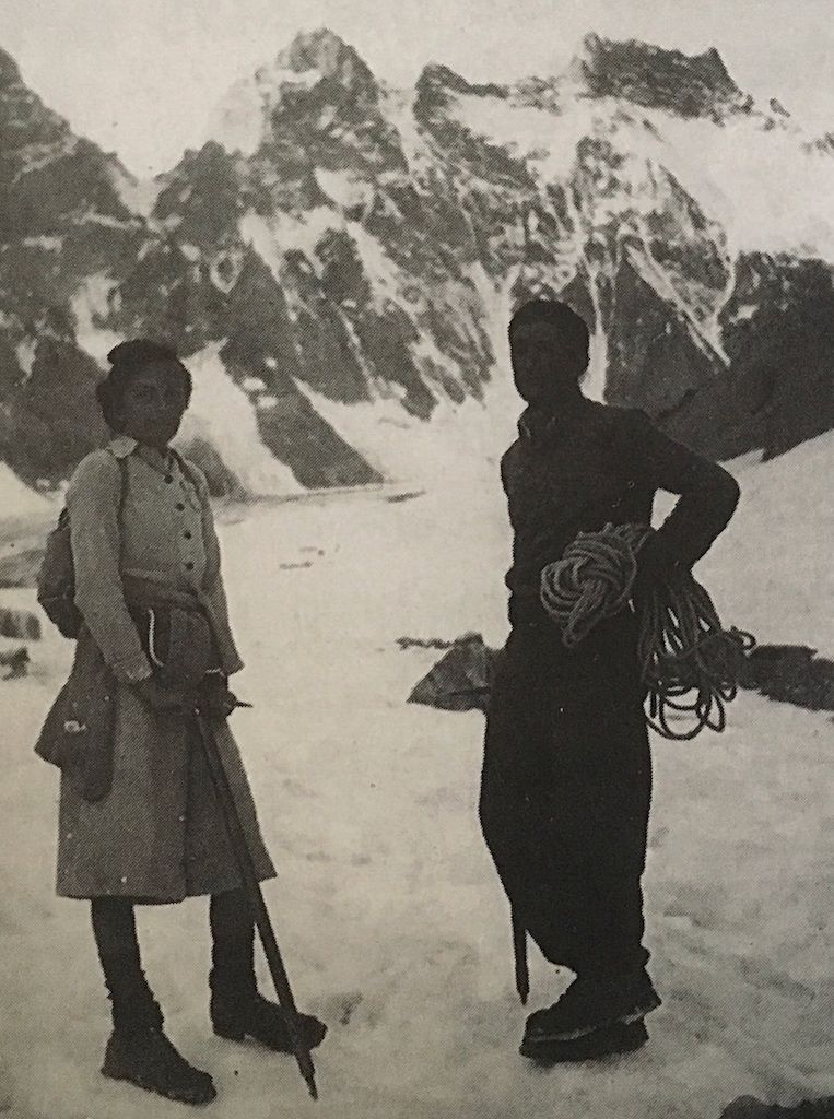 Sa robe longue n’empêche pas l’encordement à la taille, De toute façon en 1969 les baudriers ou harnais n’existaient pas.